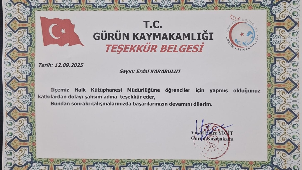 Okulumuz tarafından Gürün Halk Kütüphanesi Müdürlüğü'ne '' Kardeş Okul Protokolü'' kapsamında yapılan kitap yardımından dolayı Gürün Kaymakamlığı tarafından okul müdürlüğümüz Teşekkür Belgesi ile taltif edilmiştir.
